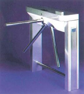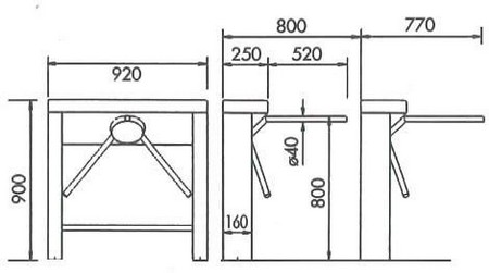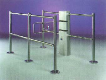 Sistema de control de acceso con tres brazos montados en un elemento giratorio. Estructura de acero inoxidable con movimiento electromecánico con dispositivo antipánico.