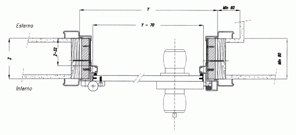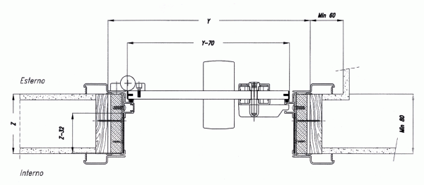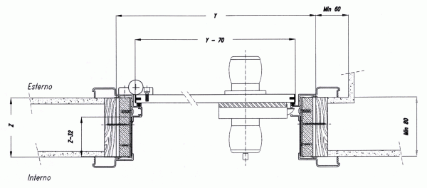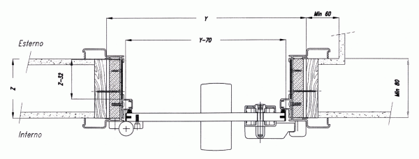 Puertas sin marco perimetral, con perfil de aluminio extruido simple para ser fijado a la pared, que realiza las funciones de soporte de las bisagras y acabado en el lado opuesto; puerta laminada laminada maciza mm. 14 con bisagras elásticas de acero inoxidable.