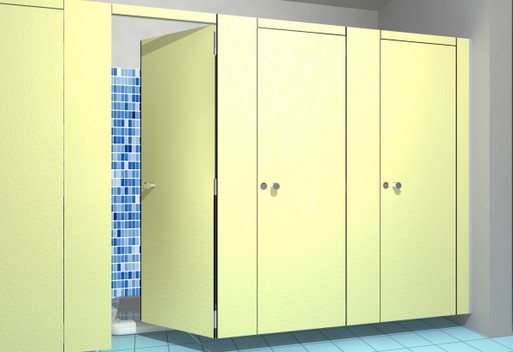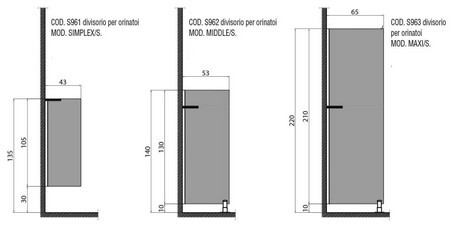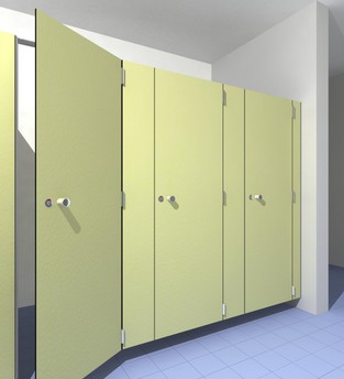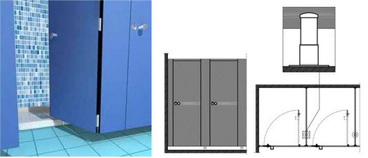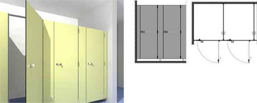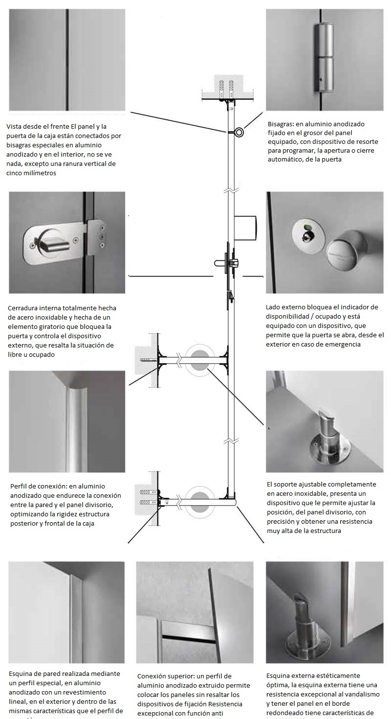 Paneles laminados autoextinguibles de HPL de 14 mm de espesor. Conexión superior por perfil extruido en aluminio anodizado natural pulido. Bases de soporte de pie, en acero inoxidable pulido espejo. Cerradura de acero inoxidable con indicador, externo, libre / ocupado. Apertura de las puertas al exterior.