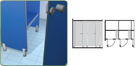 Paneles laminados anti-caída de HPL 14 mm de espesor; Conexión superior por perfil extruido en aluminio anodizado natural. Elementos de soporte de suelo en aluminio y nylon. Cerradura de nylon con indicadores de disponibilidad. Anti-ducha con banco en laminado sólido.