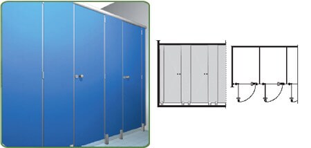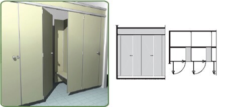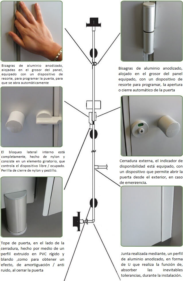 Paneles en laminado HPL de 14 mm de espesor; Conexión superior por perfil extruido en aluminio anodizado natural. Elementos de soporte de suelo en aluminio y nylon. Cerradura de nylon con indicador de libre / ocupado.