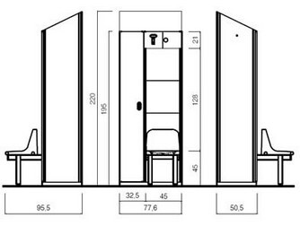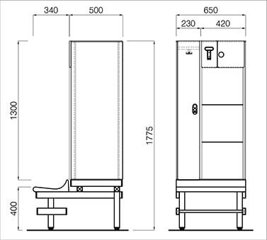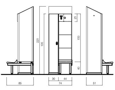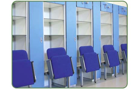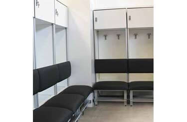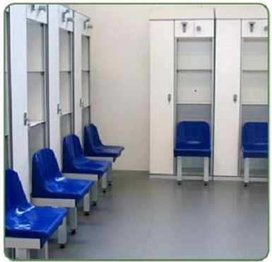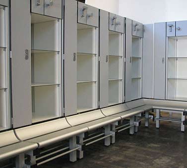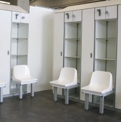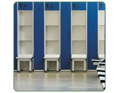 Adoptados por los principales clubes europeos, estos casilleros resuelven con precisión, las necesidades del usuario típico, el futbolista profesional, que tiene su propio asiento, un armario de altura completa, tres estantes abiertos y un compartimento especial con dos puertas, para artículos personales.